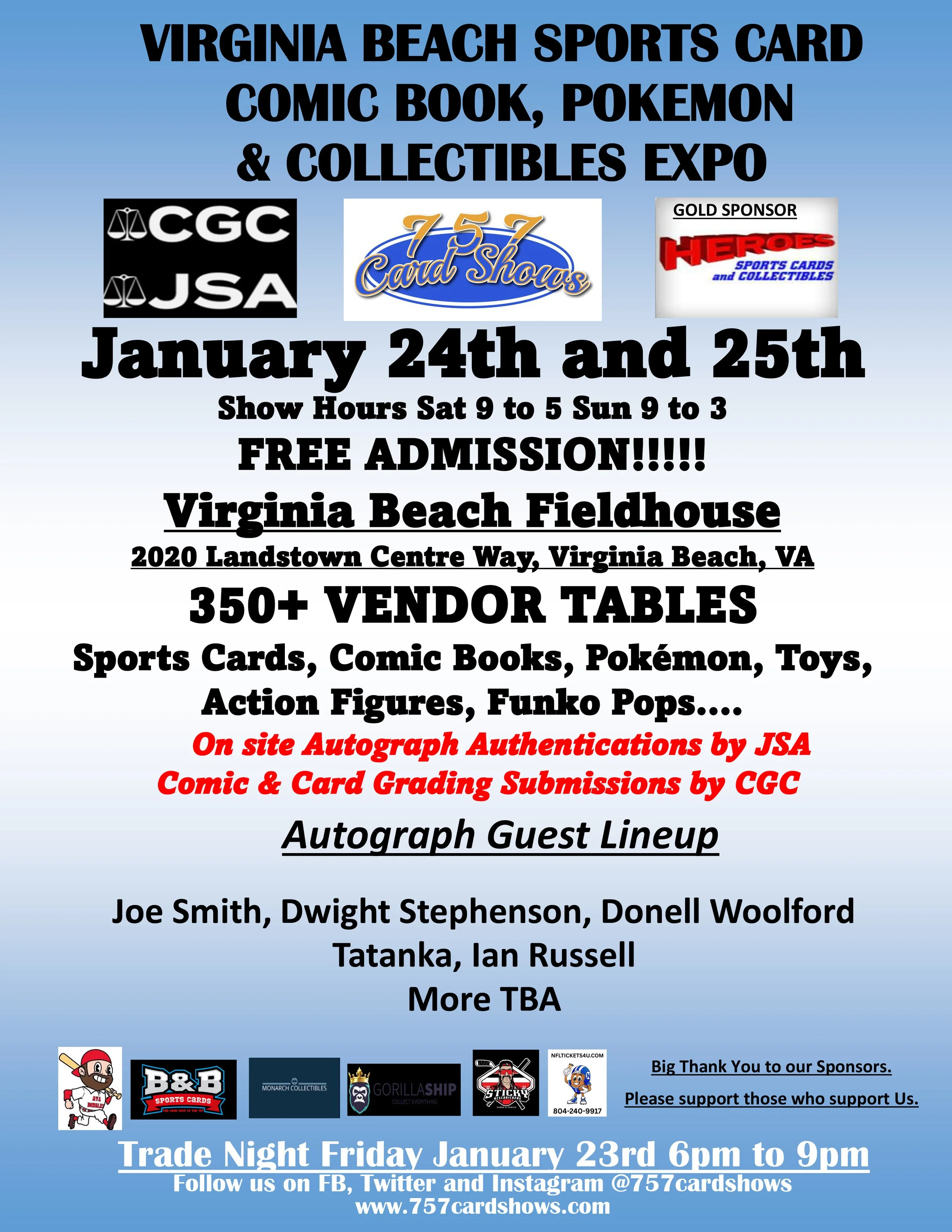 Saturday January 24th & 25th don't miss Tidewaters largest and favorite Collectibles Show🔥🔥🔥 We will have 350+ vendor tables full of Sports Cards Modern & Vintage, Comic Books, Toys, Pokémon Cards, Funko Pops, Action Figures, Hobby Supplies and other collectibles for sale. A great lineup of Sports Autograph Guest will be appearing including Joe Smith🏀 , NFL Hof'er Dwight Stephenson🏈, WWE Legend Tatanka 🤼♀️, Donnell Woolford 🏈, Mike Lavalliere ⚾ along with Local Legend ⚾Sam Allen. JSA will be on site authenticating autographs ✒️. CGC Cards & Comics will be on site taking submissions for Card Grading. Doors Open at 9am⏱️ and show runs till 5pm on Saturday. Doors Open back on Sunday at 9am till 3pm. 🆓Free Admission 🆓Free Parking Full Service Grille on site.